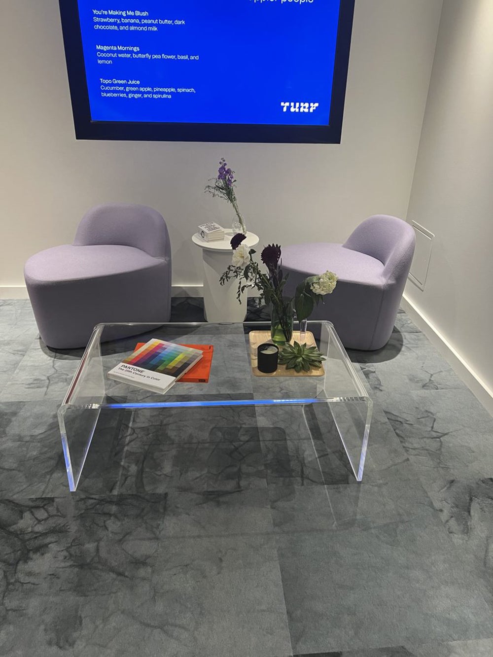 También se hace referencia en la tendencia Neo-Deco identificada por García al uso de pasteles. García define la paleta de colores Neo-Deco: "los tonos de joyas complejos se combinan con pasteles resaltados de lila, bígaro y champán, así como verde y dorado". Nuestro equipo de diseño notó el uso extensivo de pasteles en textiles y tapicería en NeoCon 2022. Los tonos claros, particularmente los tonos púrpura, a menudo se combinaban con colores brillantes, como el amarillo.