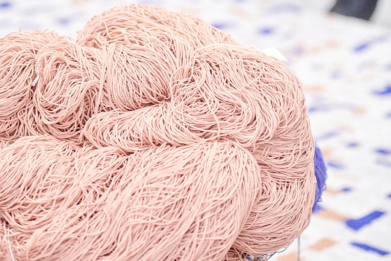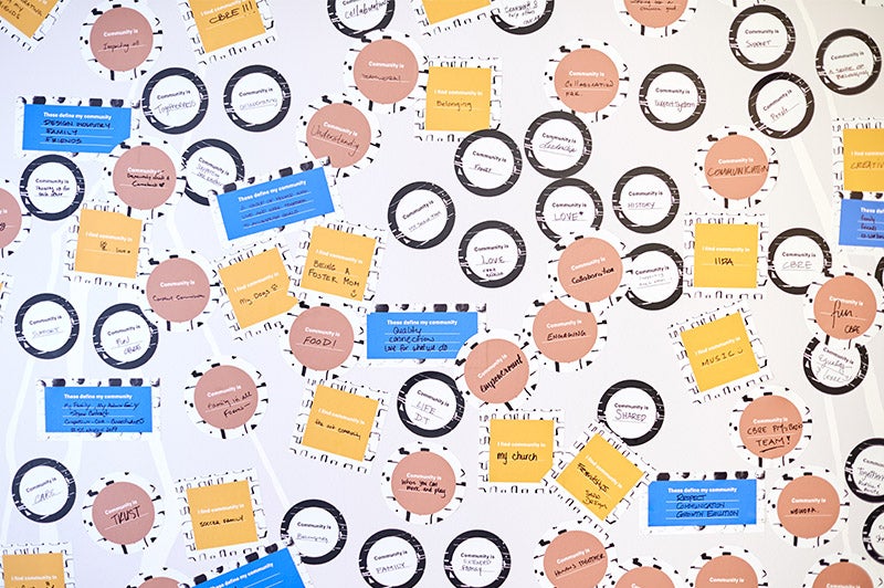 O Need to Belong foi o espaço que reservamos para a nossa coleção Community, uma coleção multifacetada com construções de carpetes modulares, em rolo, tapetes e um produto resistente em COREtec. Essa área do showroom era prática, contava com tapetes de carpetes suspensos que apresentavam nossa nova tecnologia de fabricação "Tailor Tuft" usada nesta coleção. A parede do Community estava coberto de adesivos com as definições de comunidade dos visitantes até o final da exposição.