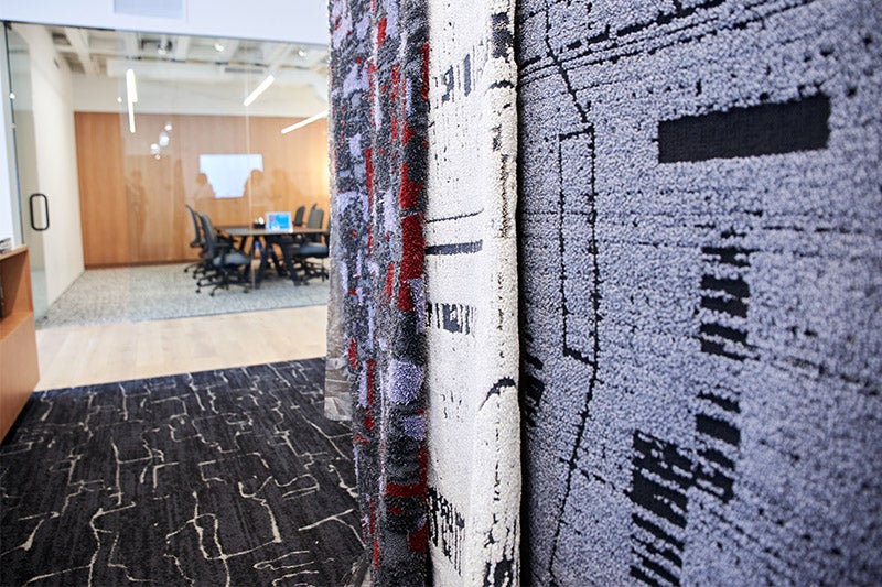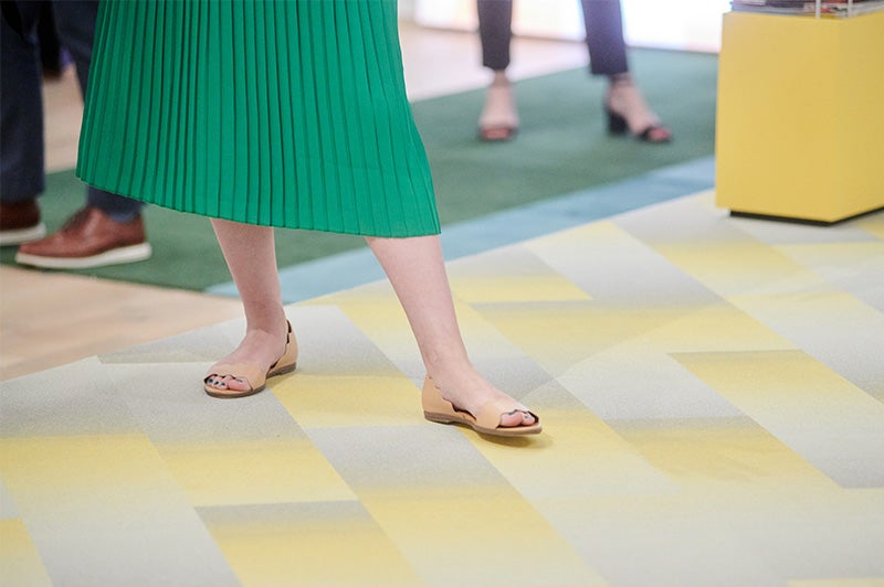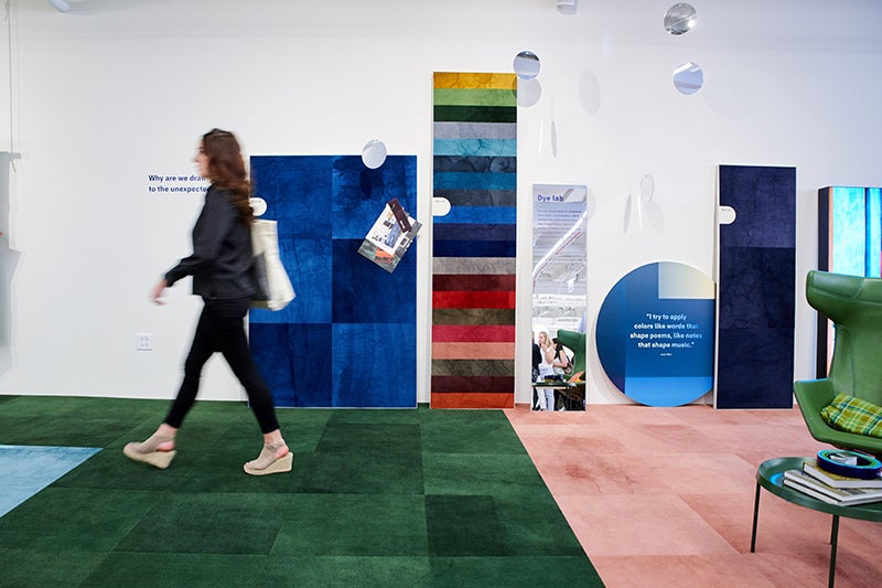 A área da frente do showroom era uma festa visual. A Color Study (Um Estudo de Cores) foi composto de três coleções: o carpete modular Gradation, o LVT woven reFrame e o carpete modular Dye Lab. Você pode ver uma influência digital distinta no Gradation e no reFrame, enquanto a atualização de cores do Dye Lab tem tudo a ver com experimentação e efeitos visuais imprevisíveis. Mal podemos esperar para lançá-los nos próximos meses!