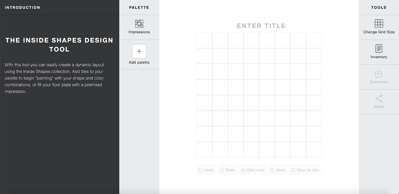 No final do ano passado lançamos a coleção Inside Shapes, uma inovação tanto para nós como para a indústria de carpetes modulares. Como é uma coleção revolucionária e com infinitas possibilidades de design criamos uma ferramenta de design exclusiva para esses produtos. Na ferramenta você terá duas opções: usar um de nossos ‘Idea Starters’ ou criar um piso totalmente personalizado.